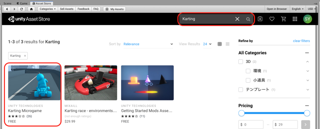 2.検索エリアに「Karting」と入力します。