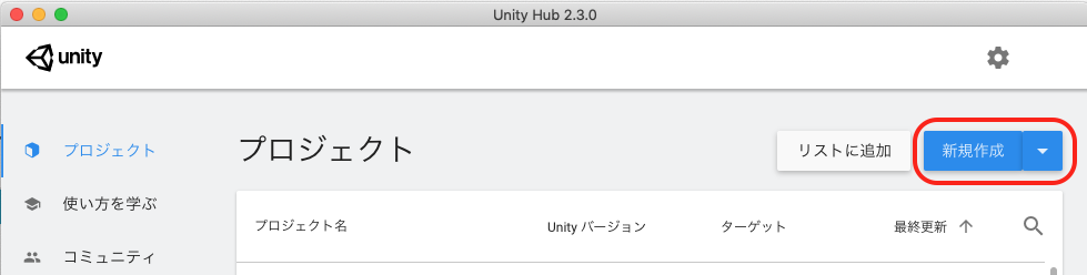 Unity Hubから新規作成します。