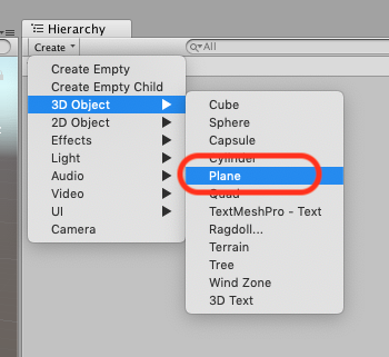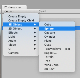 Create > 3D Object > Sphere で球(Sphere : スフィア)をつくろう