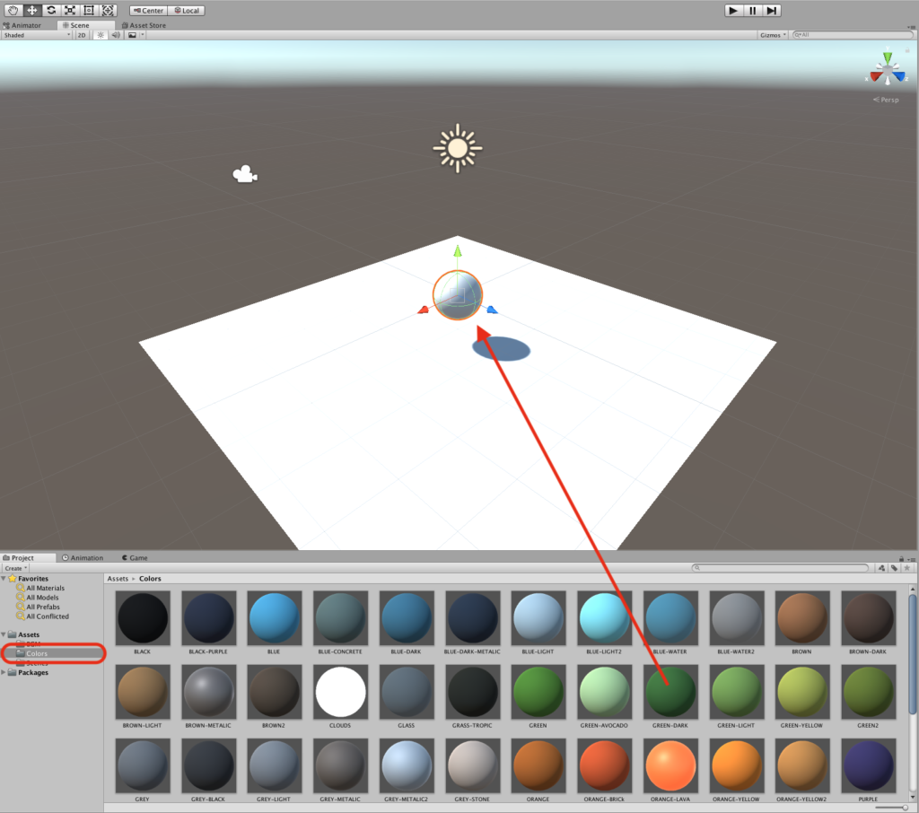 その色(マテリアル)を色を付けたいオブジェクトにドラックします。