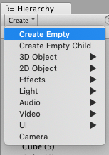 Hierarchy -> Create Empty でからのオブジェクト(GameObject)をつくります。