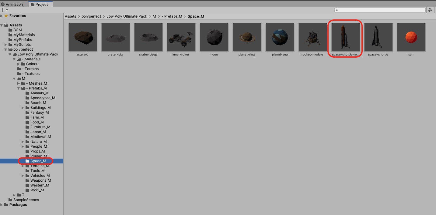 まずAssets > polyperfect > Low Poly Ultimate Pack > M > – Prefabs_M > Space_M にある「space-shuttle-rockets」プレファブをシーンに入れましょう。