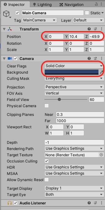 カメラの座標と設定を↓のようにします。