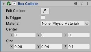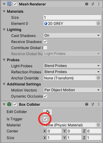 3.インスペクター画面でRigidbodyとBox Coliderを加え、下のように設定します。